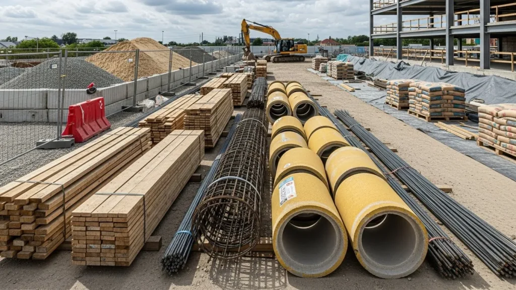 Materiais de construção são os insumos básicos que compõem a obra, desde cimento e tijolos até revestimentos e acabamentos.