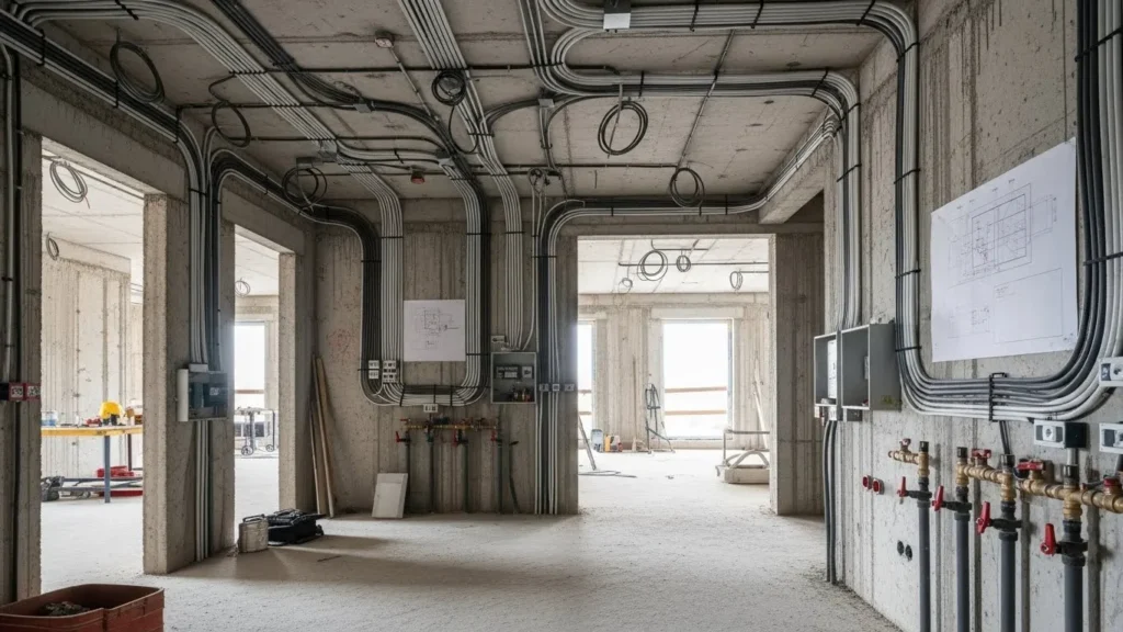 Essas instalações permitem o uso de equipamentos, iluminação e outras necessidades durante a construção, além de facilitar testes e verificações posteriores.